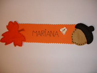 Marcador de livros feito em EVA, com aplicações alusivas ao Outono e com o nome da pessoa^_^