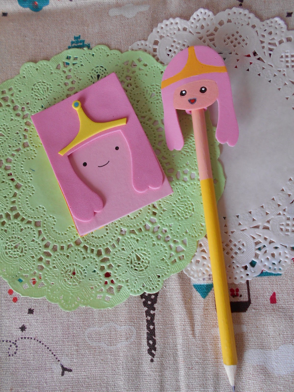 Para as meninas fiz estas ponteiras da Princesa Chiclete e pequenos livrinhos com restos de caixas de cereais e restos de papel ^_^